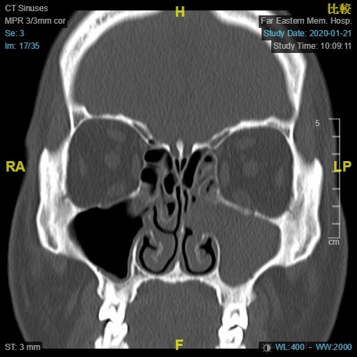 左側鼻竇炎之電腦斷層檢查,左側上頷竇異常